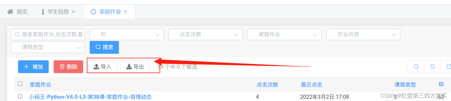 4,重启项目,在后台管理页面中就能看到导入和导出的按钮了。